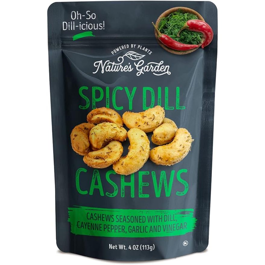 Designed for those on the go, these artisanal nuts are conveniently packaged in 4 oz (128g) snack packs, with 6 packs included in each box. Whether you're tossing one in your purse, lunch box, or hiking bag, you can easily snack on the move. But these cashews aren't just delicious, they're also good for you. Loaded with heart-healthy fats, protein, fiber, and essential minerals, they help your body produce energy, support brain function, and keep your bones strong. So refuel and recharge with Nature's Garden Spicy Dill Cashews. Description by ChatGPT.
