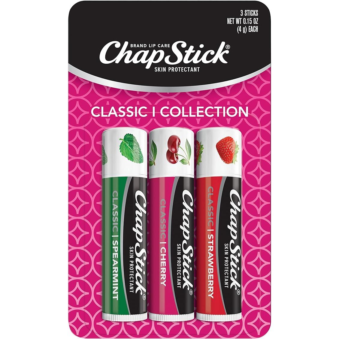 ChapStick Classic is a popular skin protectant lip balm that comes in a pack of three sticks. Each stick contains 0.15 ounces of product. The ChapStick Classic pack offers three different flavors: cherry, strawberry, and spearmint.